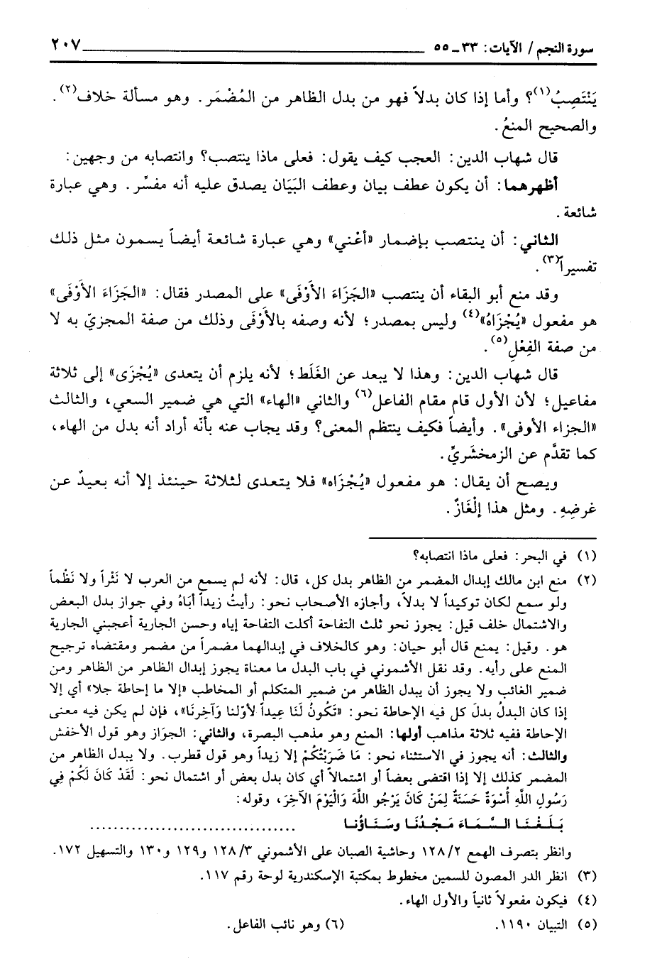 قال شهاب الدين: وهذا لا يبعد عن الغَلَط؛ لأنه يلزم أن يتعدى «يُجْزَى» إلى ثلاثة مفاعيل؛ لأن الأول قام مقام الفاعل والثاني «الهاء» التي هي ضمير السعي، والثالث «الجزاء الأوفى» . وأيضاً فكيف ينتظم المعنى؟ وقد يجاب عنه بأنّه أراد أنه بدل من الهاء، كما تقدَّم عن الزمخشَريِّ.