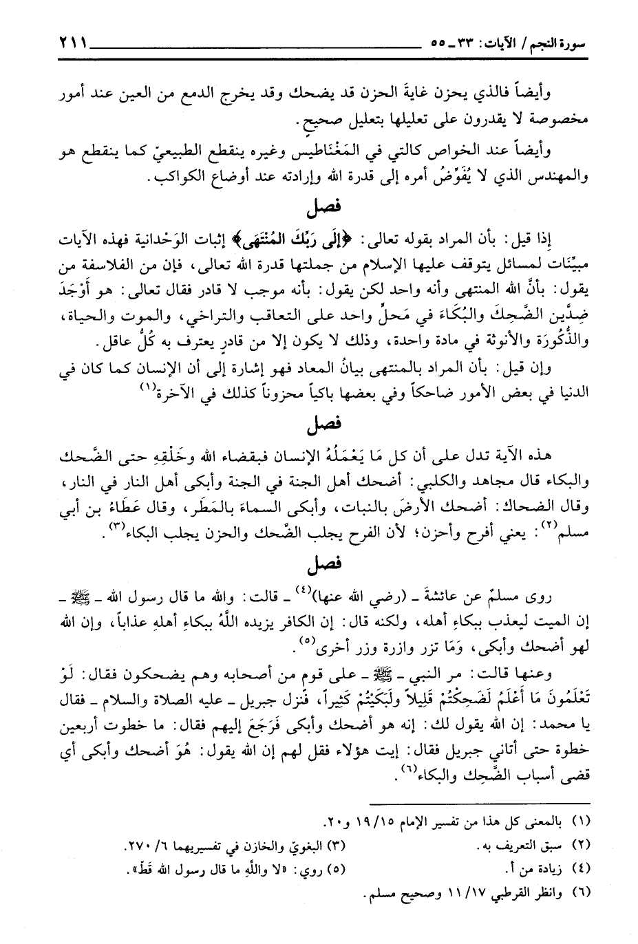 وعنها قالت: «مر النبي - صَلَّى اللَّهُ عَلَيْهِ وَسَلَّم َ - على قومٍ من أصحابه وهم يضحكون فقال: لَوْ تَعْلَمُونَ مَا أَعْلَمُ لَضَحِكْتُمْ قَلِيلاً ولَبَكَيْتُمْ كَثِيراً، فنزل جبريل - عَلَيْهِ الصَّلَاة وَالسَّلَام ُ - فقال يا محمد: إن الله يقول لك: إنه هو أضحك وأبكى فَرَجَعَ إليهم فقال: ما خطوت أربعين خطوة حتى أتاني جبريل فقال: إيت هؤلاء فقل لهم إن الله يقول: هُوَ أضحك وأبكى»