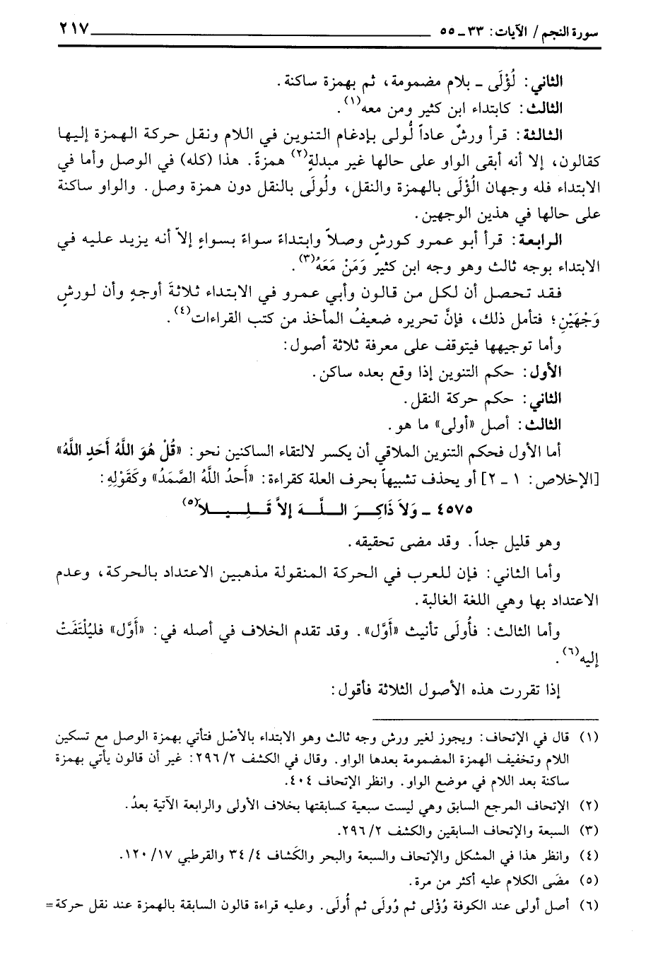 الثالثة: قرأ ورشٌ عاداً لُّولى بإدغام التنوين في اللام ونقل حركة الهمزة إليها كقالون، إلا أنه أبقى الواو على حالها غير مبدلةٍ همزةً. هذا (كله) في الوصل وأما في الابتداء فله وجهان الُؤْلَى بالهمزة والنقل، ولُولَى بالنقل دون همزة وصل. والواو ساكنة على حالها في هذين الوجهين.