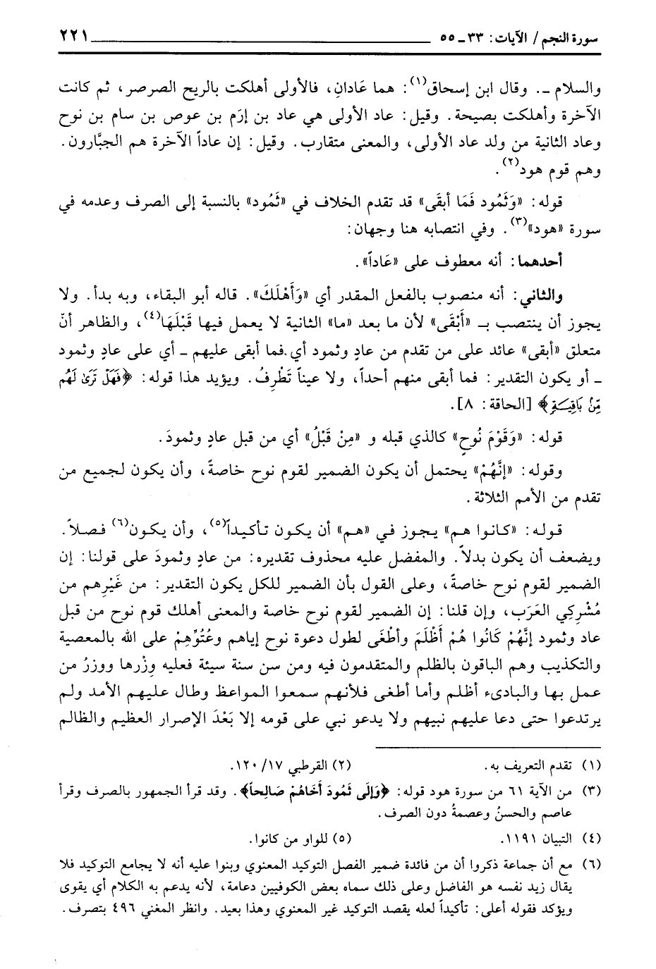 قوله: {وَثَمُودَ فَمَآ أبقى} قد تقدم الخلاف في «ثَمُود» بالنسبة إلى الصرف وعدمه في سورة «هود» . وفي انتصابه هنا وجهان: