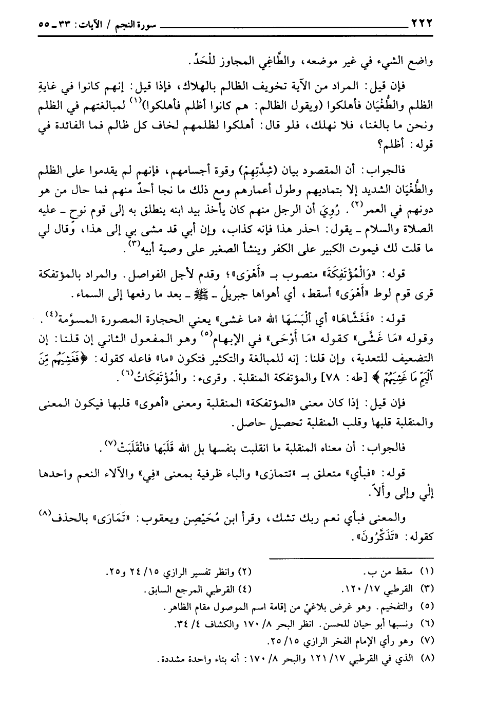 قوله: «وَالمُؤْتَفِكَةَ» منصوب ب «أَهْوَى» ؛ وقدم لأجل الفواصل. والمراد بالمؤتفكة قرى قوم لوط «أَهْوَى» أسقط، أي أهواها جبريلُ - صَلَّى اللَّهُ عَلَيْهِ وَسَلَّم َ - بعد ما رفعها إلى السماء.
