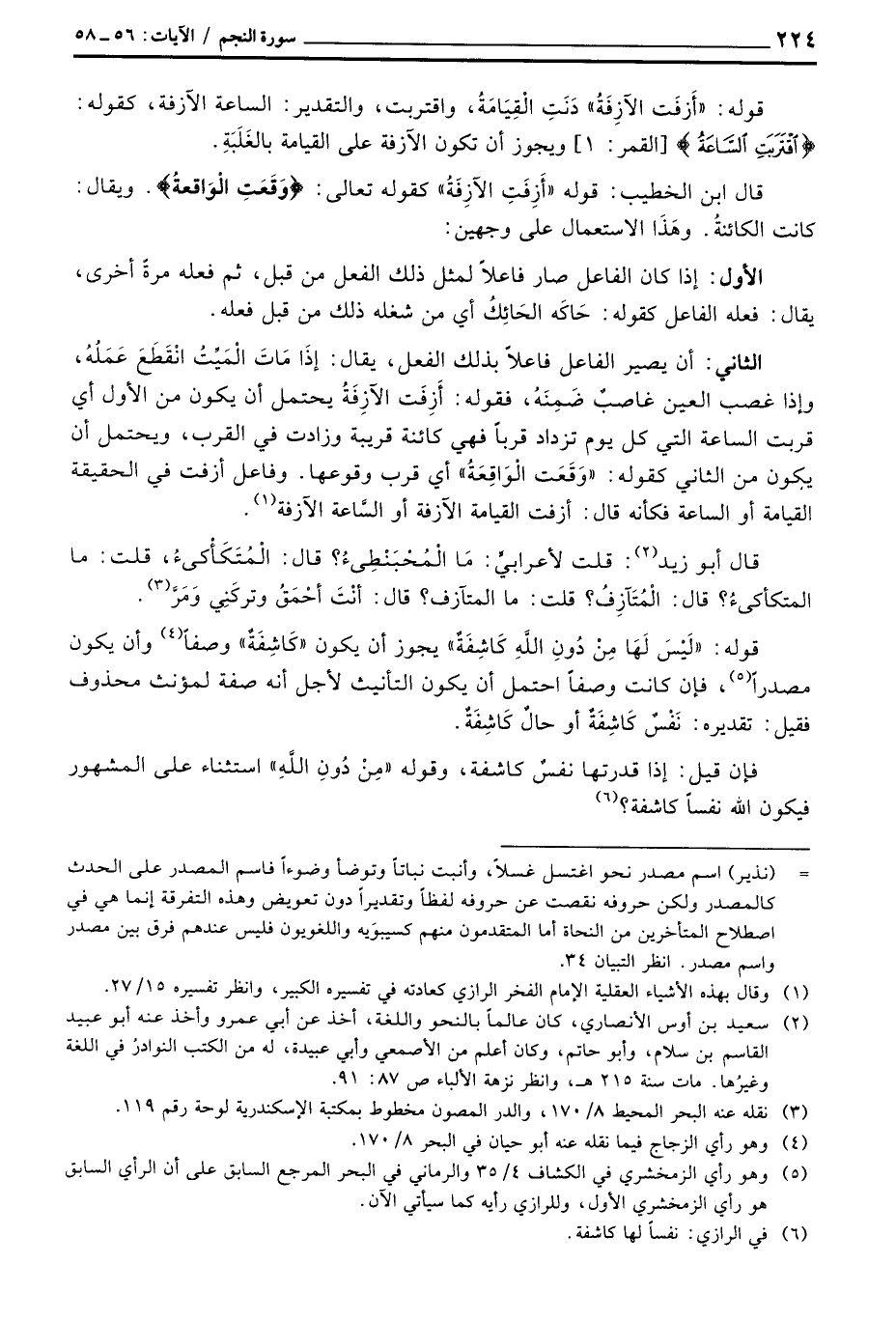 الثاني: أن يصير الفاعل فاعلاً بذلك الفعل، يقال: إذَا مَاتَ الْمَيِّتُ انْقَطَعَ عَمَلُهُ، وإذا غصب العين غاصبٌ ضَمِنَهُ، فقوله: أَزِفَت الآزِفَةُ يحتمل أن يكون من الأول أي قربت الساعة التي كل يوم تزداد قرباً فهي كائنة قريبة وزادت في القرب، ويحتمل أن يكون من الثاني كقوله: «وَقَعَت الْوَاقِعَةُ» أي قرب وقوعها. وفاعل أزفت في الحقيقة القيامة أو الساعة فكأنه قال: أزفت القيامة الآزفة أو السَّاعة الآزفة.