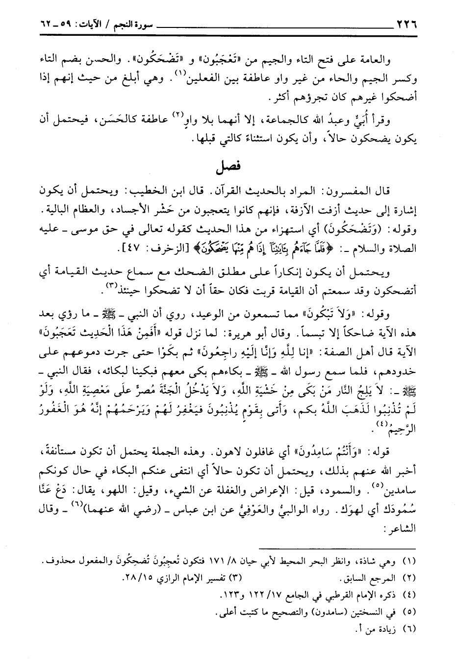 وقوله: «وَلاَ تَبْكُونَ» مما تسمعون من الوعيد، روي أن النبي - صَلَّى اللَّهُ عَلَيْهِ وَسَلَّم َ - ما رؤي بعد هذه الآية ضاحكاً إلا تبسماً. وقال أبو هريرة: «لما نزل قوله {أَفَمِنْ هذا الحديث تَعْجَبُونَ} الآية قال أهل الصفة:» إنا لِلَّهِ وَإِنَّا إلَيْهِ رَاجِعُونَ «ثم بكَوْا حتى جرت دموعهم على خدودهم، فلما سمع رسول الله - صَلَّى اللَّهُ عَلَيْهِ وَسَلَّم َ - بكاءهم بكى معهم فبكينا لبكائه، فقال النبي - صَلَّى اللَّهُ عَلَيْهِ وَسَلَّم َ -: لاَ يَلِجُ النَّار مَنْ بَكَى مِنْ خَشْيَةِ اللَّهِ، وَلاَ يَدْخُلُ الْجَنَّةَ مُصرٌّ علَى مَعْصِيَةِ اللَّهِ، وَلَوْ لَمْ تُذْنِبُوا لَذَهَبَ اللَّهُ بكم، وَأَتى بِقَوْمٍ يُذْنِبُونَ فيَغْفِرُ لَهُمْ وَيَرْحَمُهُمْ إنَّهُ هُوَ الْغَفُورُ الرَّحِيمُ» .