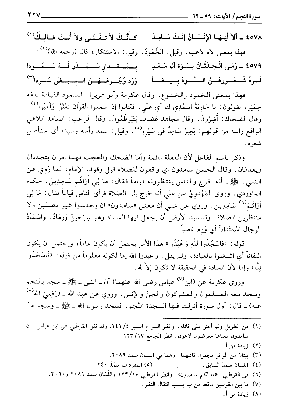 فهذا بمعنى الخمود والخشوع، وقال عكرمة وأبو هريرة: السمود القيامة بلغة حِمْيَر، يقولون: يا جَارِيَةُ اسمُدِي لنا أي غنِّي، فكانوا إذا سمعوا القرآن تَغَنَّوْا وَلَعِبُوا. وقال الضحاك: أَشِرُونَ. وقال مجاهد غضاب يَتَبَرْطَعُونَ. وقال الراغب: السامد اللاهي الرافع رأسه من قولهم: بَعِيرٌ سَامِدٌ في سَيْرِهِ. وقيل: سمد رأسه وسبده أي استأصل شعره.