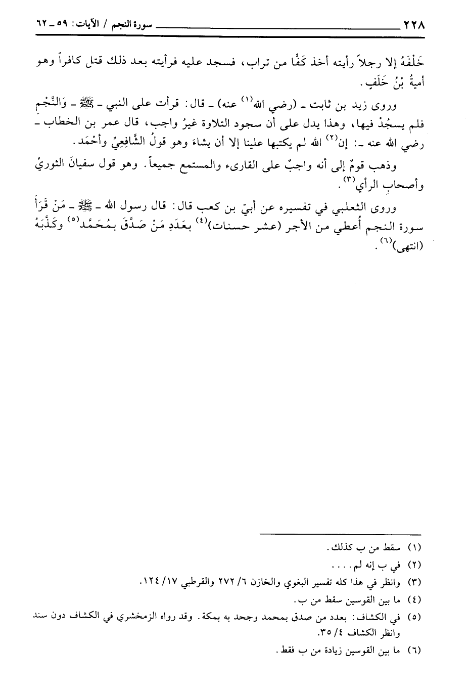 وروى زيد بن ثابت - (رَضِيَ اللَّهُ عَنْه) - قال: قرأت على النبي - صَلَّى اللَّهُ عَلَيْهِ وَسَلَّم َ - وَالنَّجْمِ فلم يسجُدْ فيها، وهذا يدل على أن سجود التلاوة غيرُ واجب، قال عمر بن الخطاب - رَضِيَ اللَّهُ عَنْه -: إن الله لم يكتبها علينا إلا أن يشاءَ وهو قولُ الشَّافِعِيِّ وأحْمَد.