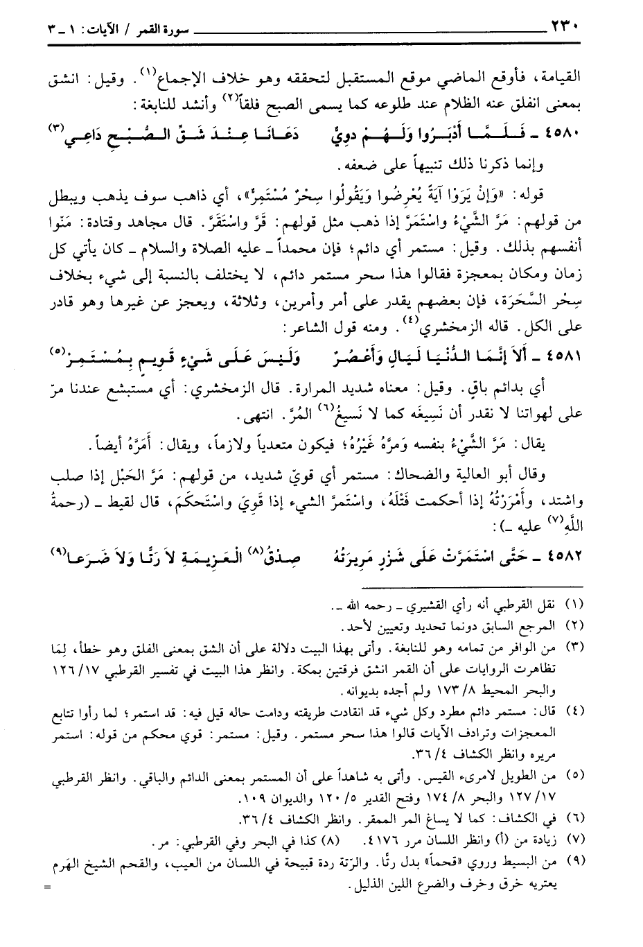 قوله: {وَإِن يَرَوْاْ آيَةً يُعْرِضُواْ وَيَقُولُواْ سِحْرٌ مُّسْتَمِرٌّ} ، أي ذاهب سوف يذهب ويبطل من قولهم: مَرَّ الشَّيْءُ واسْتَمَرَّ إذا ذهب مثل قولهم: قَرَّ واسْتَقَرَّ. قال مجاهد وقتادة: مَنّوا أنفسهم بذلك. وقيل: مستمر أي دائم؛ فإن محمداً - عَلَيْهِ الصَّلَاة وَالسَّلَام ُ - كان يأتي كل زمان ومكان بمعجزة فقالوا هذا سحر مستمر دائم، لا يختلف بالنسبة إلى شيء بخلاف سِحْر السَّحَرَة، فإن بعضهم يقدر على أمر وأمرين، وثلاثة، ويعجز عن غيرها وهو قادر على الكل. قاله الزمخشري. ومنه قول الشاعر: