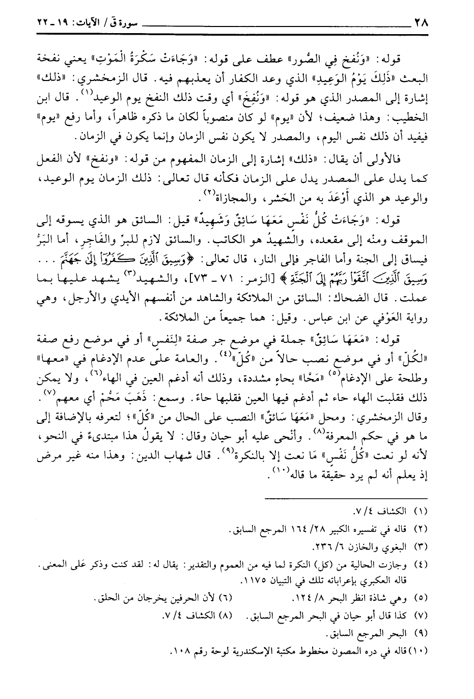 قوله: «مَعَهَا سَائِقٌ» جملة في موضع جر صفة «لِنَفسٍ» أو في موضع رفع صفة «لكُلّ» أو في موضع نصب حالاً من «كُلّ» . والعامة على عدم الإدغام في «معها» وطلحة على الإدغام «مَحَّا» بحاءٍ مشددة، وذلك أنه أدغم العين في الهاء، ولا يمكن ذلك فقلبت الهاء حاء ثم أدغم فيها العين فقلبها حاءً.