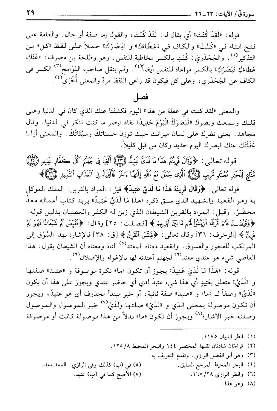 والمعنى {لقد كنت في غفلة من هذا} اليوم فكشفنا عنك الذي كان في الدنيا وعلى قلبك وسمعك وبصرك {فَبَصَرُكَ اليوم حَدِيدٌ} نفاذ تبصر ما كنت تنكر في الدنيا. وقال مجاهد: يعني نظرك على لسان ميزانك حيث توزن حسناتكَ وسيِّئَاتُكَ. والمعنى أزلنا غَفْلَتَك عنك فبصرك اليوم حديد وكان من قبل كليلاً.