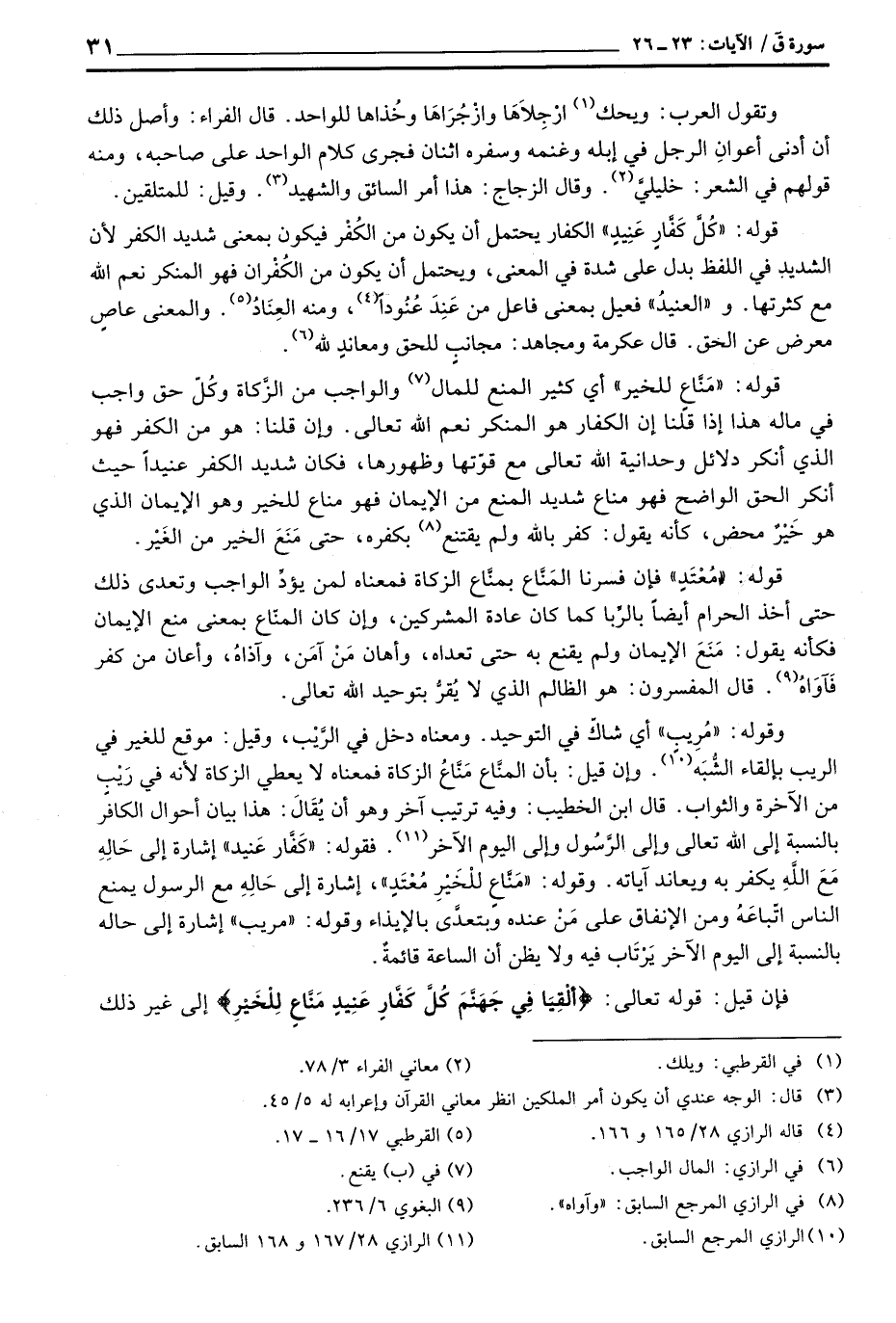 قوله: {كُلَّ كَفَّارٍ عَنِيدٍ} الكفار يحتمل أن يكون من الكُفْر فيكون بمعنى شديد الكفر لأن الشديد في اللفظ بدل على شدة في المعنى، ويحتمل أن يكون الكُفْران فهو المنكر نعم الله مع كثرتها.
