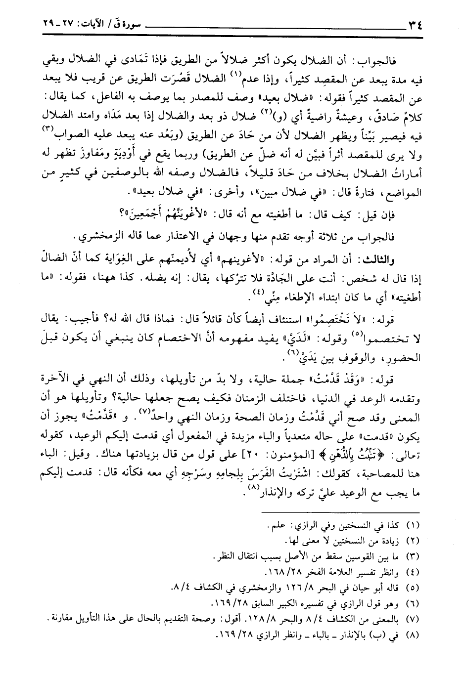 فالجواب: أن الضلال يكون أكثر ضلالاً من الطريق فإذا تَمَادى في الضلال وبقي فيه مدة يبعد عن المقصِد كثيراً، وإذا عدم الضلال قَصُرَت الطريق عن قريب فلا يبعد عن المقصد كثيراً فقوله: «ضلال بعيد» وصف للمصدر بما يوصف به الفاعل، كما يقال: كلامٌ صَادقٌ، وعيشةٌ راضيةٌ أي (و) ضلال ذو بعد والضلال إذا بعد مَدَاه وامتد الضلال فيه فيصير بَيِّناً ويظهر الضلال لأن من حَادَ عن الطريق (وبَعُد عنه يبعد عليه الصواب ولا يرى للمقصد أثراً فبيَّن له أنه ضلّ عن الطريق) وربما يقع في أَوْدِيَةٍ ومَفاوزَ تظهر له أماراتُ الضلال بخلاف من حَادَ قليلاً، فالضلال وصفه الله بالوصفين في كثيرٍ من المواضع، فتارةً قال: {في ضلال مبين} ، وأخرى: {في ضلال بعيد} .