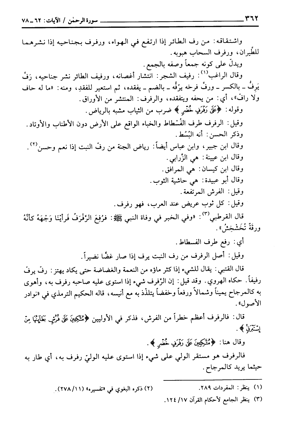 وقال الراغب: رفيف الشجر: انتشار أغصانه، ورفيف الطائر نشر جناحيه، رَفَّ يَرِفُّ - بالكسر - ورفَّ فرخه يرُفُّه - بالضم - يفقده، ثم استعير للفقدِ، ومنه: «ما له حاف ولا رافّ» ، أي: من يحفه ويتفقده، والرفرف: المنتشر من الأوراق.