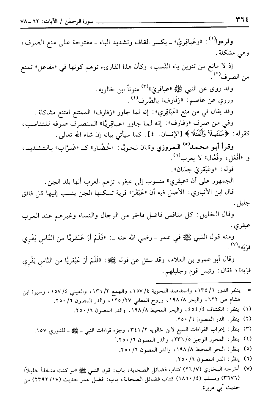 وفي من صرف «رَفارف» : إنه لما جاور «عباقِريًّا» المنصرف صرفه للتناسب، كقوله: {سَلاَسِلاَ وَأَغْلاَلاً} [الإنسان: 4] . كما سيأتي بيانه إن شاء الله تعالى.