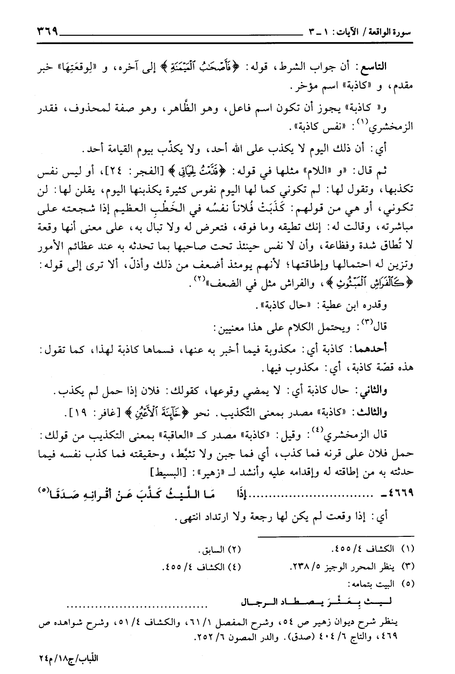التاسع: أن جواب الشرط، قوله: {فَأَصْحَابُ الميمنة} [الواقعة: 8] إلى آخره، و «لِوقعَتِهَا» خبر مقدم، و «كاذبة» اسم مؤخر.