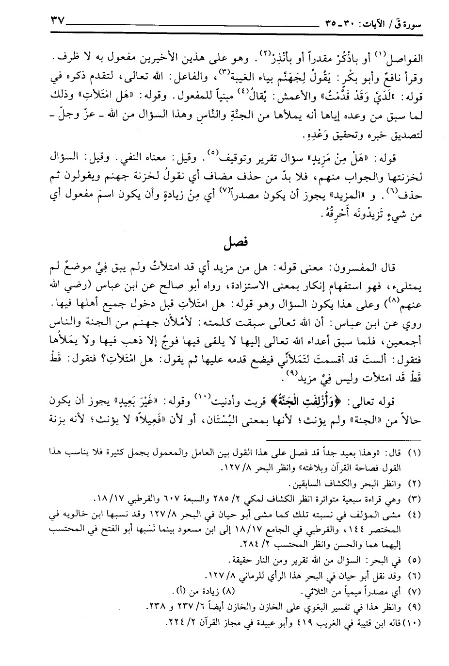 قوله: {هَلْ مِن مَّزِيدٍ} سؤال تقرير وتوقيف. وقيل: معناه النفي. وقيل: السؤال لخزنتها والجواب مبهم، فلا بدّ من حذف مضاف أي نقولُ لخزنة جهنم ويقولون ثم حذف. و «المزيد» يجوز أن يكون مصدراً أي مِنْ زيادةٍ وأن يكون اسمَ مفعول أي من شيءٍ تَزيدُونَه أَحْرِقُهُ.