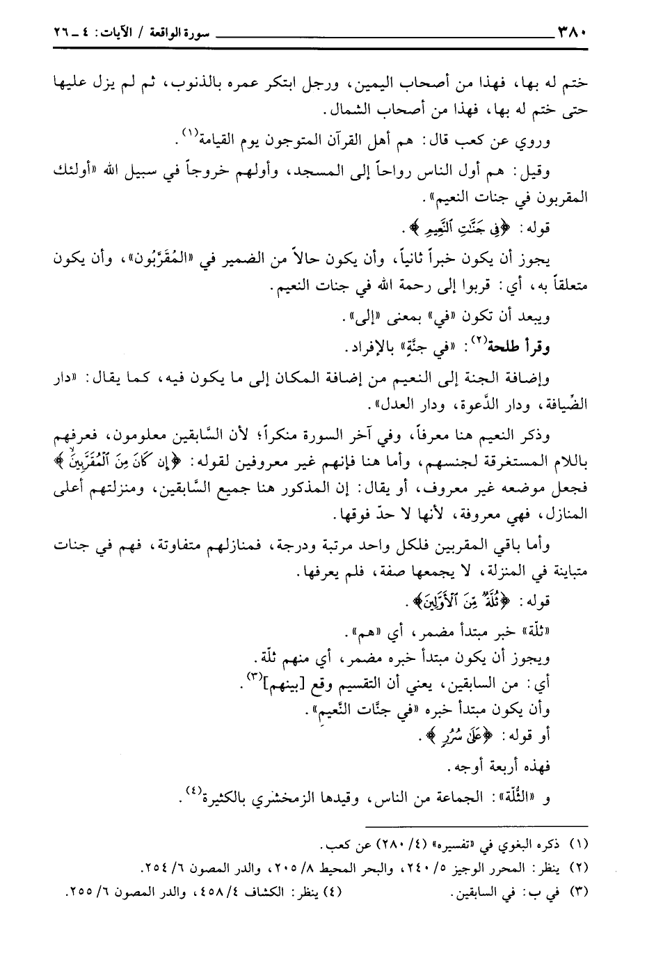 وذكر النعيم هنا معرفاً، وفي آخر السورة منكراً؛ لأن السَّابقين معلومون، فعرفهم باللام المستغرقة لجنسهم، وأما هنا فإنهم غير معروفين لقوله: {إِن كَانَ مِنَ المقربين} [الواقعة: 88] فجعل موضعه غير معروف، أو يقال: إن المذكور هنا جميع السَّابقين، ومنزلتهم أعلى المنازل، فهي معروفة، لأنها لا حدّ فوقها.