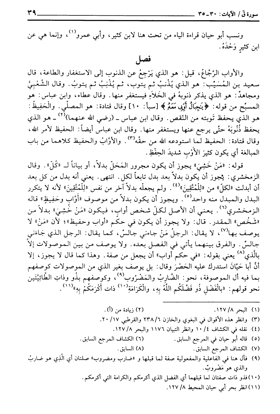 قوله: «مَنْ خَشِيَ» يجوز أن يكون مجرور المَحَلّ بدلاً، أو بياناً ل «كُلّ» . وقال الزمخشري: يجوز أن يكون بدلاً بعد بدل تابعاً لكل. انتهى. يعني أنه بدل من كل بعد أن أبدلت «لكلّ» من «لِلْمُتَّقِينَ» . ولم يجعلْه بدلاً آخر من نفس «لِلْمُتَّقِينَ» لأنه لا يتكرر البدل والمبدل منه واحد. ويجوز أن يكون بدلاً من موصوف «أَوَّابٍ وحَفِيظٍ» قاله الزمخشري. يعني أن الأصل لكلّ شخص أوابٍ، فيكون «مَنْ خَشِيَ» بدلاً من «شَخْص» المقدر. قال: ولا يجوز أن يكون في حكم «أواب وحفيظ» ؛ لأن «مَنْ» لا يوصف بها، لا يقال: الرجلُ مَنْ جاءني جالسٌ، كما يقال: الرجل الذي جَاءَني جالسٌ. والفرق بينهما يأتي في الفصل بعده. ولا يوصف من بين الموصولات إلاَّ بالَّذي يعني بقوله: «في حكم أواب» أن يجعل من صفة. وهذا كما قال لا يجوز، إلا أنَّ أبا حَيَّانَ استدرك عليه الحَصْرَ وقال: بل يوصف بغير الذي من الموصولات كوصفهم بما فيه أل الموصوفة، نحو: الضَّارِبُ والمَضْرُوب، وكوصفهم بذُو وذاتِ الطَّائِيَّتَين نحو قولهم: «بالْفَضْلِ ذُو فَضَّلَكُم اللَّهُ بِهِ، والْكَرَامَةِ ذات أَكْرَمَكُمْ بِهِ» .