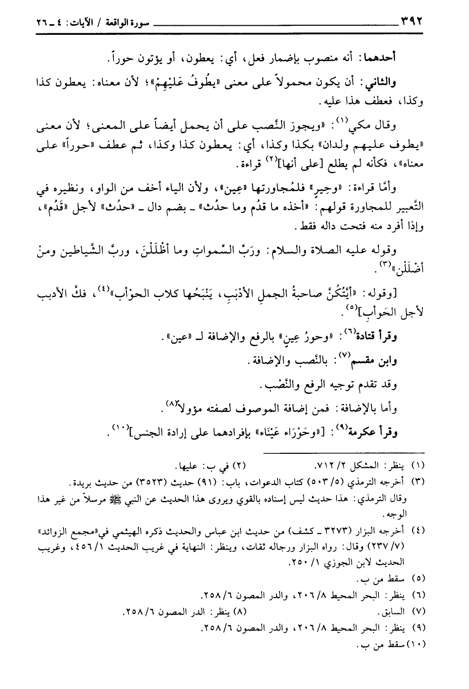 وأمَّا قراءة: «وحِيرٍ» فلمُجاورتها «عِين» ، ولأن الياء أخف من الواو، ونظيره في التَّعبير للمجاورة قولهم: «أخذه ما قدُم وما حدُث» - بضم دال - «حدُث» لأجل «قَدُم» ، وإذا أفرد منه فتحت داله فقط.