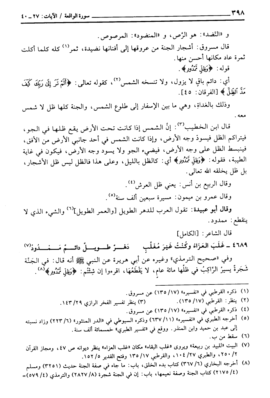 وفي «صحيح الترمذي» وغيره عن أبي هريرة عن النبي صَلَّى اللَّهُ عَلَيْهِ وَسَلَّم َ أنه قال: «في الجَنَّة شَجَرةٌ يسيرُ الرَّاكِبُ في ظلِّها مائة عامٍ، لا يَقْطَعُهَا، اقرءوا إن شِئْتُم: {وَظِلٍّ مَّمْدُودٍ} » .