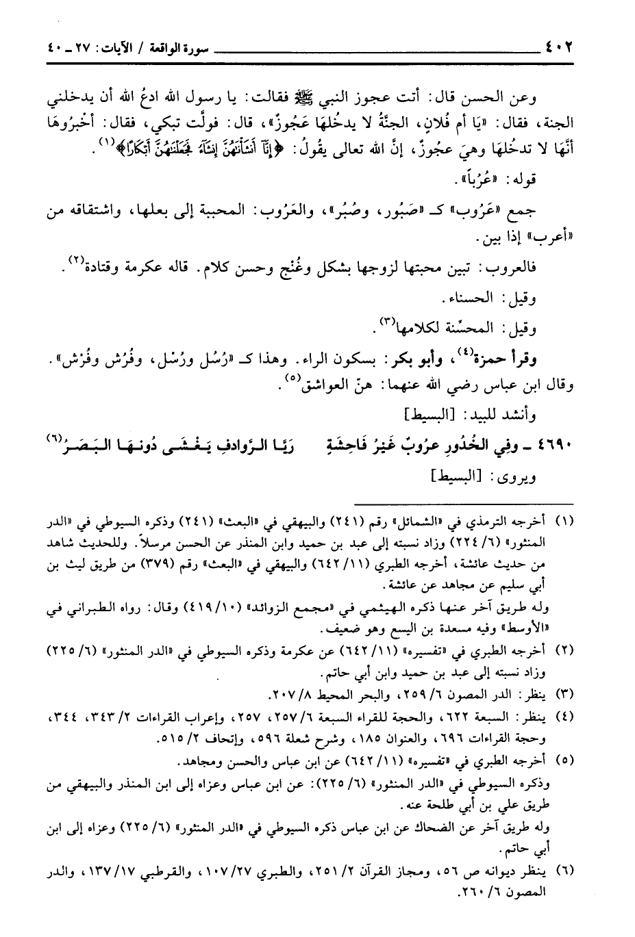 وعن الحسن قال: «أتت عجوز النبي صَلَّى اللَّهُ عَلَيْهِ وَسَلَّم َ فقالت: يا رسول الله ادعُ الله أن يدخلني الجنة، فقال:» يَا أم فُلانٍ، الجنَّةُ لا يدخُلهَا عَجُوزٌ «، قال: فولَّت تبكي، فقال: أخْبرُوهَا أنَّهَا لا تدخُلهَا وهيَ عجُوزٌ، إنَّ الله تعالى يقُولُ: {إِنَّآ أَنشَأْنَاهُنَّ إِنشَآءً فَجَعَلْنَاهُنَّ أَبْكَاراً} » .