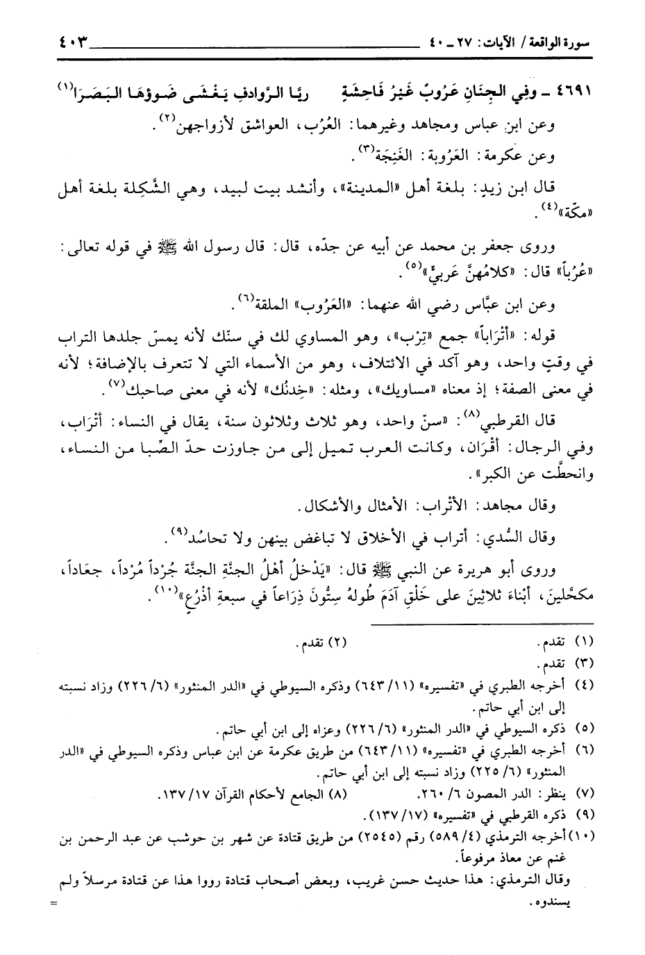 «وروى جعفر بن محمد عن أبيه عن جدّه، قال: قال رسول الله صَلَّى اللَّهُ عَلَيْهِ وَسَلَّم َ في قوله تعالى:» عُرُباً «قال:» كلامُهنَّ عَربيٌّ «» .