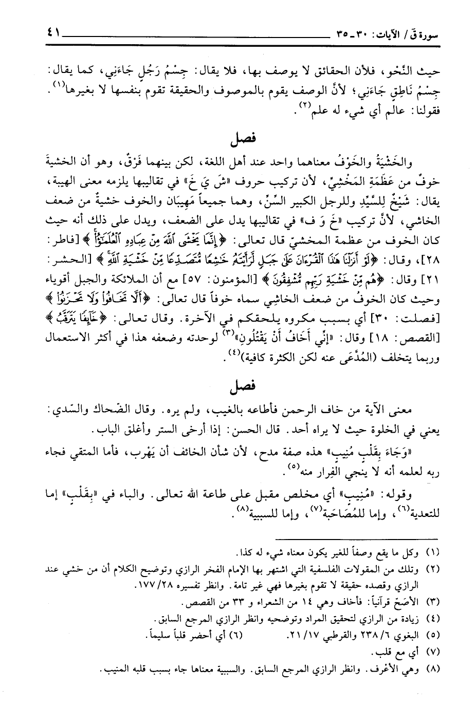 والخَشْيَةُ والخَوْفُ معناهما واحد عند أهل اللغة، لكن بينهما فَرْقٌ، وهو أن الخشيةَ خوفٌ من عَظَمَةِ المَخْشِيِّ، لأن تركيب حروف «شَ يَ خَ» في تقاليبها يلزمه معنى الهيبة، يقال: شَيْخٌ لِلسَّيِّدِ وللرجل الكبير السِّنِّ، وهما جميعاً مَهِيبَان والخوف خشيةٌ من ضعف الخاشي، لأنَّ تركيب «خَ وَف» في تقاليبها يدل على الضعف، ويدل على ذلك أنه حيث كان الخوف من عظمة المخشيّ قال تعالى: {إِنَّمَا يَخْشَى الله مِنْ عِبَادِهِ العلماء} [فاطر: 28] ، وقال: {هُم مِّنْ خَشْيةِ رَبِّهِمْ مُّشْفِقُونَ} [المؤمنون: 57] مع أن الملائكة والجبل أقوياء وحيث كان الخوفُ من ضعف الخاشِي سماه خوفاً قال تعالى: