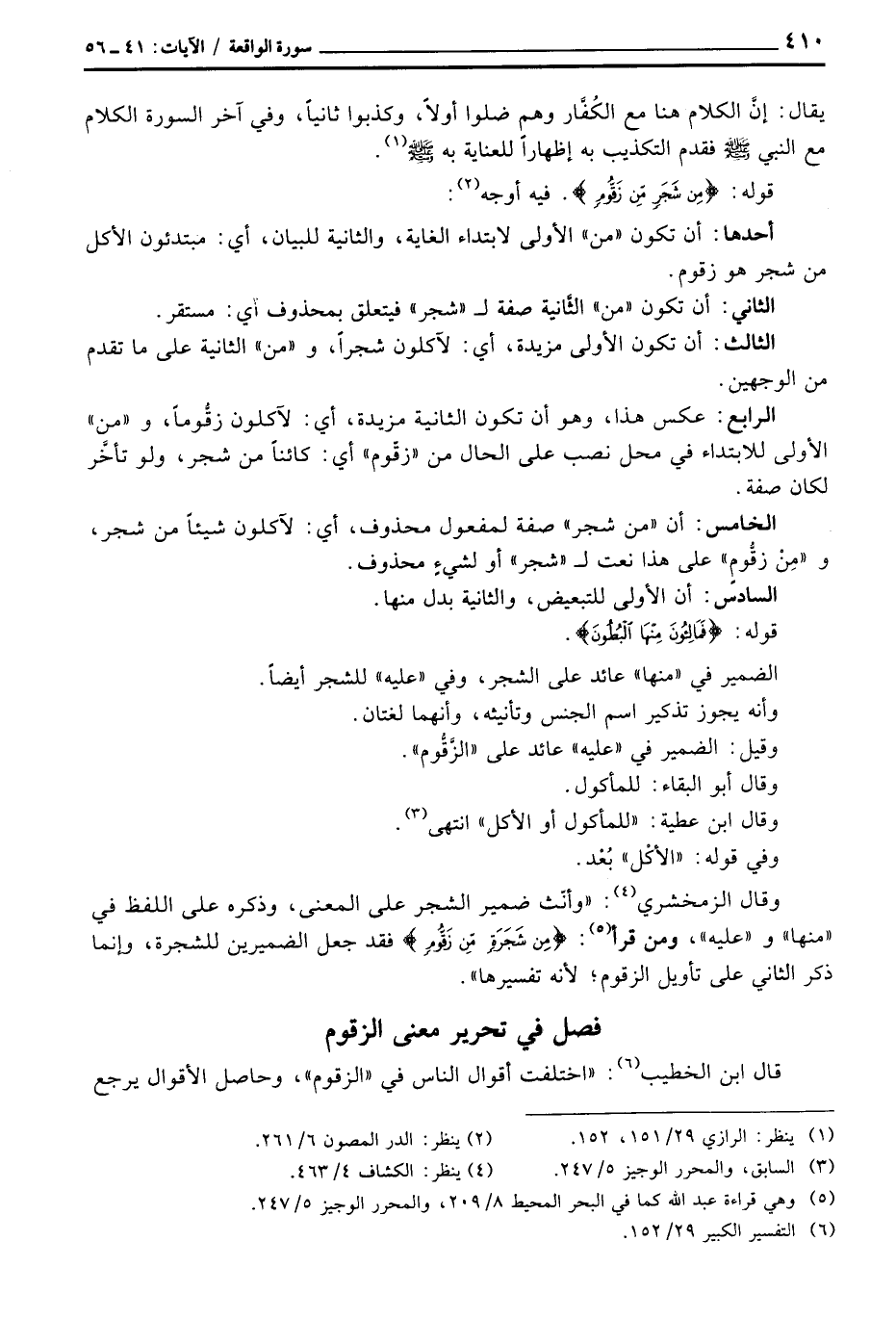 قال ابن الخطيب: «اختلفت أقوال الناس في» الزقوم «، وحاصل الأقوال يرجع