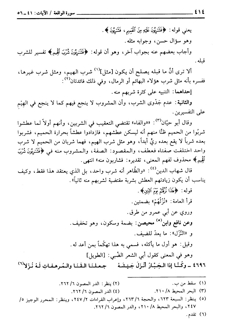 وقال أبو حيَّان: «» والفاء «تقتضي التعقيب في الشربين، وأنهم أولاً لما عطشوا شربُوا من الحميم ظنًّا منهم أنه ليسكن عطشهم، فازدادوا عطشاً بحرارة الحميم، فشربوا بعده شرباً لا يقع بعده ريٌّ أبداً، وهو مثل شرب الهيم، فهما شربان من الحميم لا شرب واحد اختلفت صفتاه فعطف، والمقصود: الصفة، والمشروب منه في {فَشَارِبُونَ شُرْبَ الهيم} محذوف لفهم المعنى، تقديره: فشاربون منه» انتهى.
