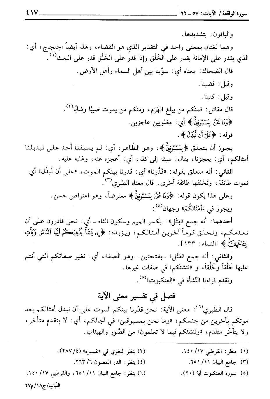 قال الطبري: معنى الآية: نحن قدّرنا بينكم الموت على أن نبدل أمثالكم بعد موتكم بآخرين من جنسكم، {وما نحن بمسبوقين} في آجالكم، أي: لا يتقدم متأخر، ولا يتأخّر متقدم، {وننشئكم فيما لا تعلمون} من الصُّور والهيئاتِ.
