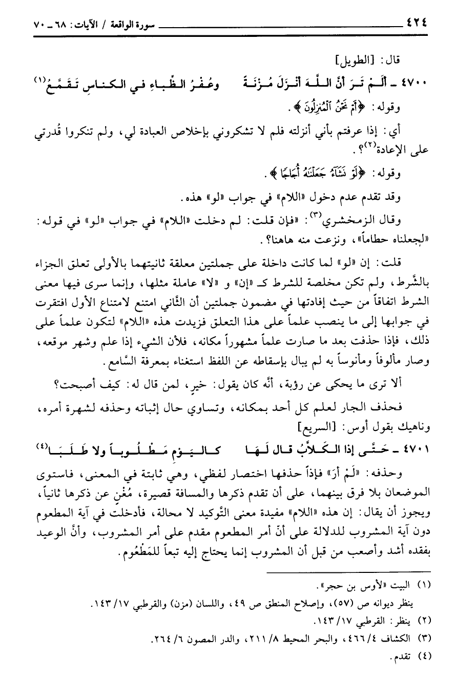 وحذفه:» لَمْ أرَ «فإذاً حذفها اختصار لفظي، وهي ثابتة في المعنى، فاستوى الموضعان بلا فرق بينهما، على أن تقدم ذكرها والمسافة قصيرة، مُغْنٍ عن ذكرها ثانياً، ويجوز أن يقال: إن هذه» اللام «مفيدة معنى التَّوكيد لا محالة، فأدخلت في آية المطعوم دون آية المشروب للدلالة على أنّ أمر المطعوم مقدم على أمر المشروب، وأنَّ الوعيد بفقده أشد وأصعب من قبل أن المشروب إنما يحتاج إليه تبعاً للمَطْعُوم.