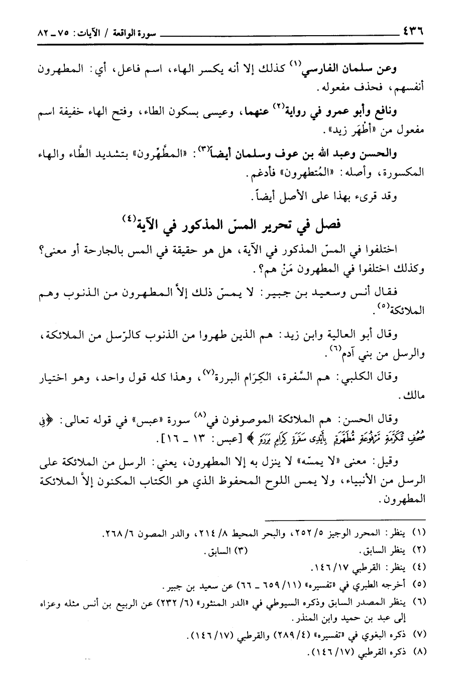 اختلفوا في المسّ المذكور في الآية، هل هو حقيقة في المس بالجارحة أو معنى؟ وكذلك اختلفوا في المطهرون مَنْ هم؟ .