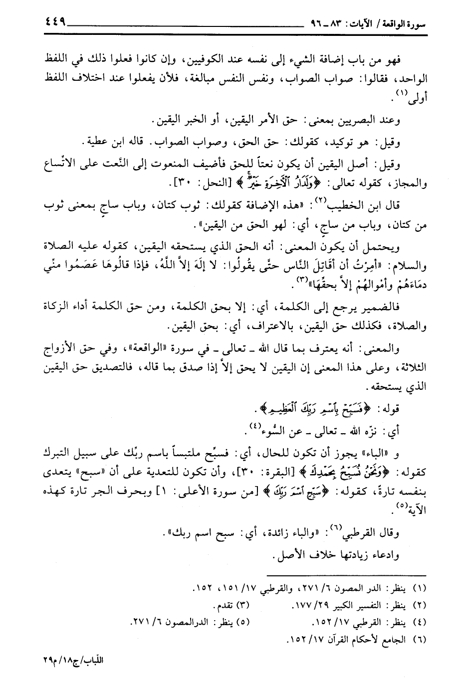 والمعنى: أنه يعترف بما قال الله - تعالى - في سورة «الواقعة» ، وفي حق الأزواج الثلاثة، وعلى هذا المعنى إن اليقين لا يحق إلاَّ إذا صدق بما قاله، فالتصديق حق اليقين الذي يستحقه.