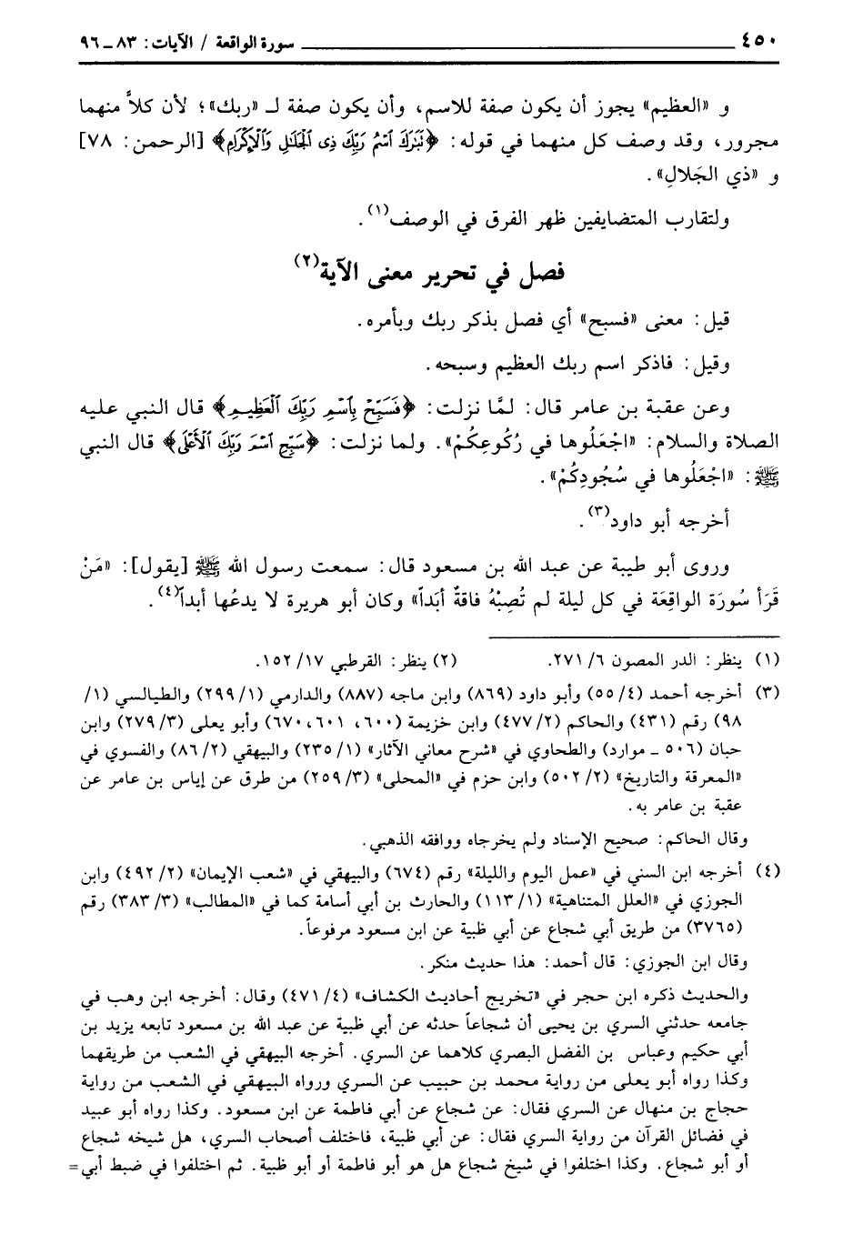 «وعن عقبة بن عامر قال: لمَّا نزلت: {فَسَبِّحْ باسم رَبِّكَ العظيم} قال النبي عَلَيْهِ الصَّلَاة وَالسَّلَام ُ:» اجْعَلُوها في رُكُوعِكُمْ «. ولما نزلت: {سَبِّحِ اسم رَبِّكَ الأعلى} قال النبي صَلَّى اللَّهُ عَلَيْهِ وَسَلَّم َ:» اجْعَلُوها في سُجُودِكُمْ «» .