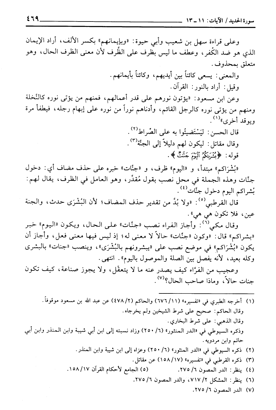 وعن ابن مسعود: «يؤتون نورهم على قدر أعمالهم، فمنهم من يؤتى نوره كالنَّخلة ومنهم من يؤتى نوره كالرجل القائم، وأدناهم نوراً من نوره على إبهام رجله، فيطفأ مرة ويوقد أخرى» .
