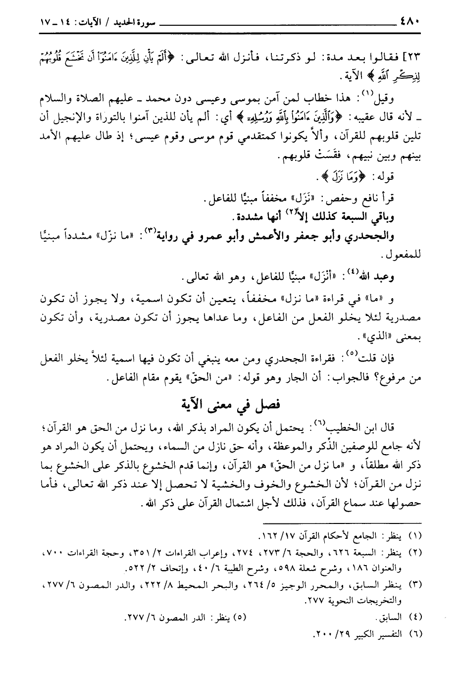 قال ابن الخطيب: يحتمل أن يكون المراد بذكر الله، وما نزل من الحق هو القرآن؛ لأنه جامع للوصفين الذِّكر والموعظة، وأنه حق نازل من السماء، ويحتمل أن يكون المراد هو ذكر الله مطلقاً، و {ما نزل من الحقّ} هو القرآن، وإنما قدم الخشوع بالذكر على الخشوع بما نزل من القرآن؛ لأن الخشوع والخوف والخشية لا تحصل إلا عند ذكر الله تعالى، فأما حصولها عند سماع القرآن، فذلك لأجل اشتمال القرآن على ذكر الله.