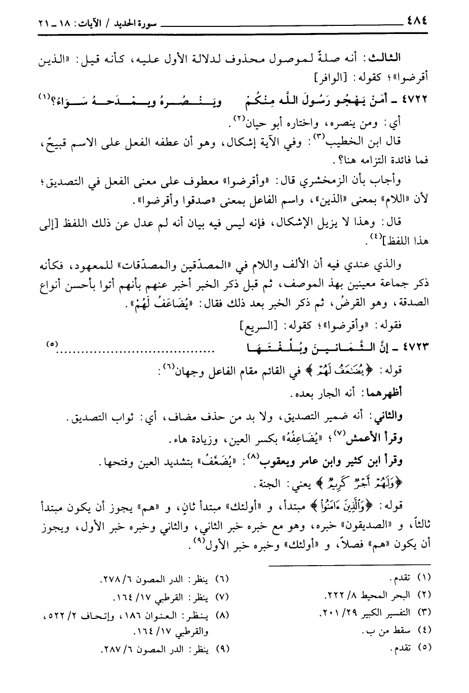 والذي عندي فيه أن الألف واللام في «المصدّقين والمصدّقات» للمعهود، فكأنه ذكر جماعة معينين بهذ الموصف، ثم قبل ذكر الخبر أخبر عنهم بأنهم أتوا بأحسن أنواع الصدقة، وهو القرضُ، ثم ذكر الخبر بعد ذلك فقال: «يُضَاعَفُ لَهُمْ» .