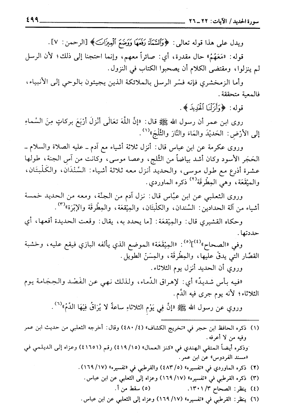 روى ابن عمر أن رسول الله صَلَّى اللَّهُ عَلَيْهِ وَسَلَّم َ قال: «إنَّ اللَّهَ تعَالَى أنْزلَ أرْبَعَ بركاتٍ مِنَ السَّماءِ إلى الأرْضِ: الحَديْدَ والمَاءَ والنَّارَ والثَّلْجَ» .