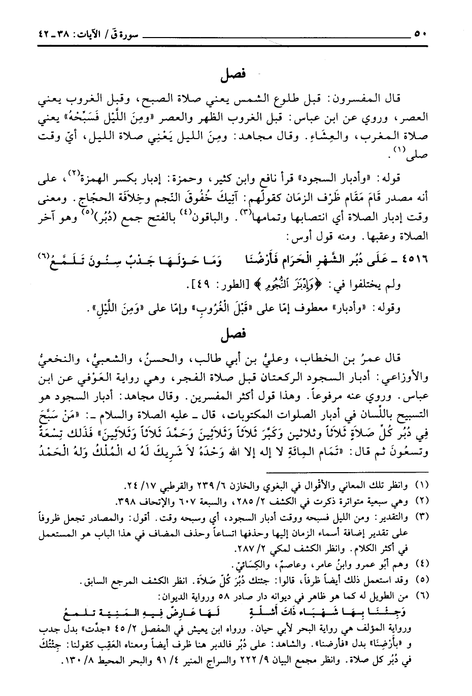 قال عمرُ بن الخطاب، وعليُّ بن أبي طالب، والحسنُ، والشعبيُّ، والنخعيُّ والأوزاعي: أدبار السجود الركعتان قبل صلاة الفجر، وهي رواية العَوْفي عن ابن عباس. وروي عنه مرفوعاً. وهذا قول أكثر المفسرين. وقال مجاهد: أدبار السجود هو التسبيح باللِّسان في أدبار الصلوات المكتوبات، قال - عَلَيْهِ الصَّلَاة وَالسَّلَام ُ -: «مَنْ سَبَّحَ فِي دُبُر كُلِّ صَلاَةٍ ثَلاَثاً وثلاثين وَكَبَّرَ ثَلاَثاً وَثَلاَثِينَ وَحَمَّدَ ثَلاَثاً وَثَلاَثِينَ» فَذَلك تِسْعَةٌ وتسعُونَ ثم قال: «تَمَام المِائَةِ لا إله إلا الله وَحْدَهُ لاَ شَرِيكَ لَهُ له الْمُلْكُ وَلهُ الْحَمْدُ