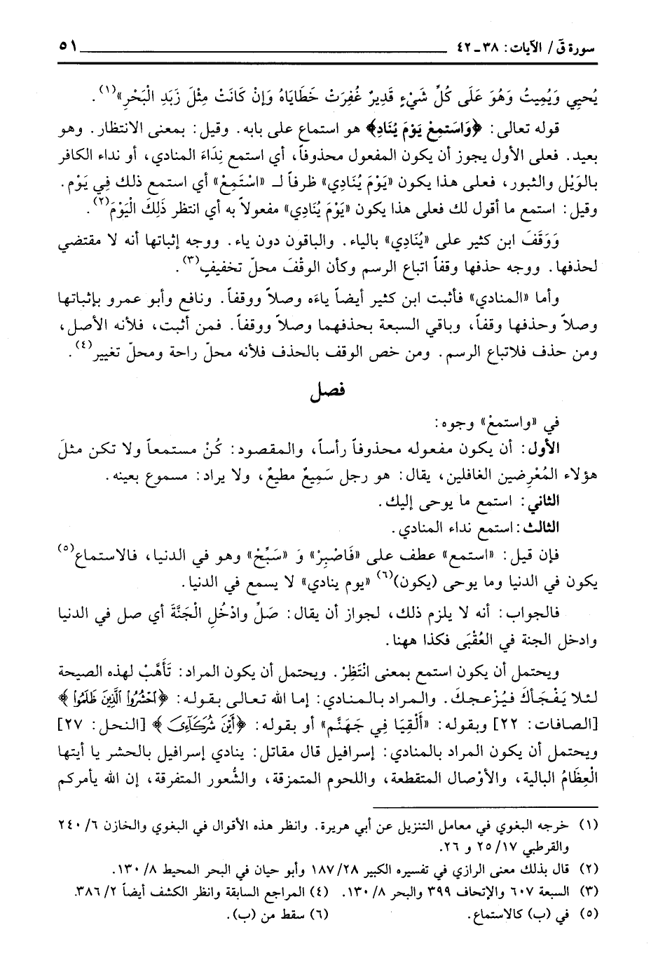 وَوَقَفَ ابن كثير على «يُنَادِي» بالياء. والباقون دون ياء. ووجه إثباتها أنه لا مقتضي لحذفها. ووجه حذفها وقفاً اتباع الرسم وكأن الوقْفَ محلّ تخفيفٍ.