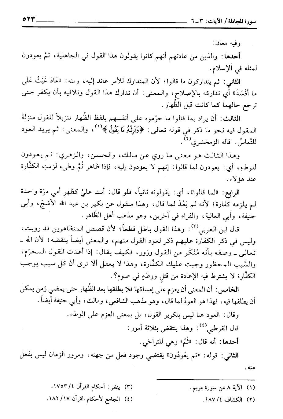 قال ابن العربي: وهذا القول باطل قطعاً؛ لأن قصص المتظاهرين قد رويت، وليس في ذكر الكفارة عليهم ذكر لعود القول منهم، والمعنى أيضاً بنقضه؛ لأن الله - تعالى - وصفه بأنه مُنْكَر من القول وزور، فكيف يقال: إذا أعدت القول المحرّم، والسَّبب المحظور وجبت عليك الكفَّارة، وهذا لا يعقل ألا ترى أنَّ كل سبب يوجب الكفَّارة لا يشترط فيه الإعادة من قتلٍ ووطءٍ في صوم؟ .