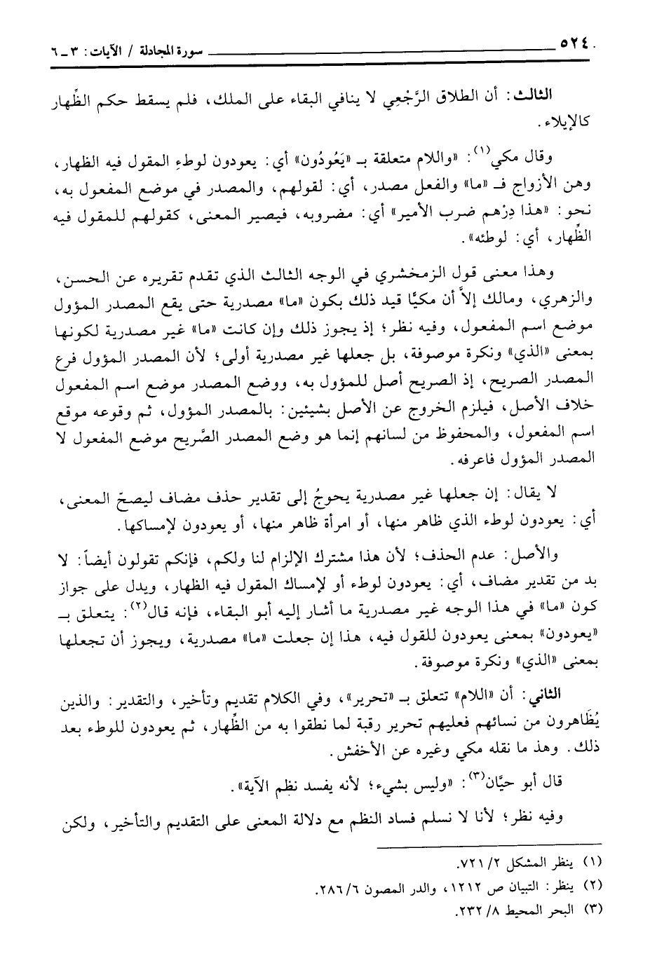 والأصل: عدم الحذف؛ لأن هذا مشترك الإلزام لنا ولكم، فإنكم تقولون أيضاً: لا بد من تقدير مضاف، أي: يعودون لوطء أو لإمساك المقول فيه الظهار، ويدل على جواز كون «ما» في هذا الوجه غير مصدرية ما أشار إليه أبو البقاء، فإنه قال: يتعلق ب «يعودون» بمعنى يعودون للقول فيه، هذا إن جعلت «ما» مصدرية، ويجوز أن تجعلها بمعنى «الذي» ونكرة موصوفة.