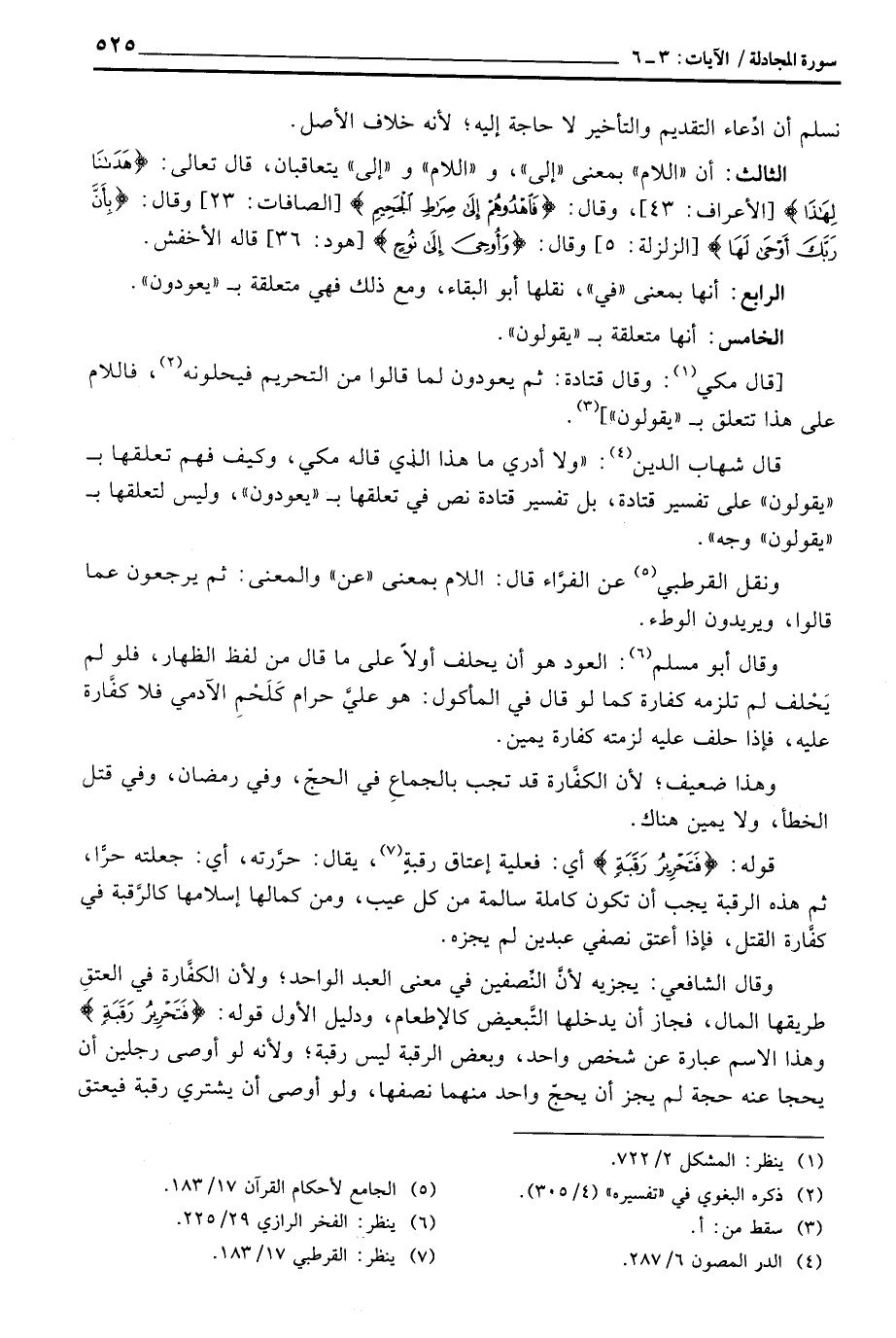 قال شهاب الدين: «ولا أدري ما هذا الذي قاله مكي، وكيف فهم تعلقها ب» يقولون «على تفسير قتادة، بل تفسير قتادة نص في تعلقها ب» يعودون «، وليس لتعلقها ب» يقولون «وجه» .