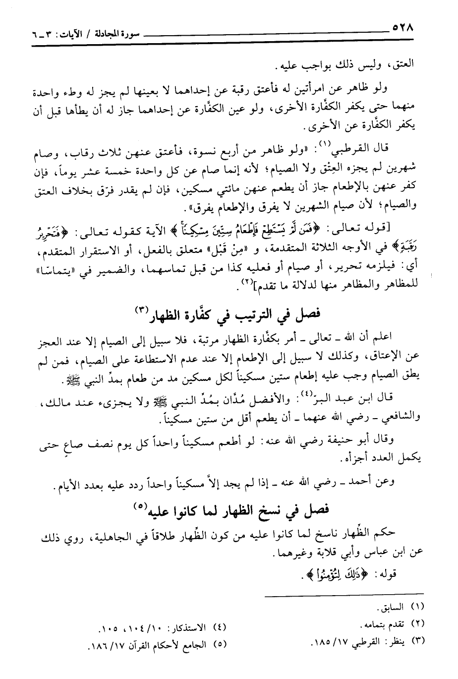 اعلم أن الله - تعالى - أمر بكفَّارة الظهار مرتبة، فلا سبيل إلى الصيام إلا عند العجز عن الإعتاق، وكذلك لا سبيل إلى الإطعام إلا عند عدم الاستطاعة على الصيام، فمن لم يطق الصيام وجب عليه إطعام ستين مسكيناً لكل مسكين مد من طعام بمدِّ النبي صَلَّى اللَّهُ عَلَيْهِ وَسَلَّم َ.