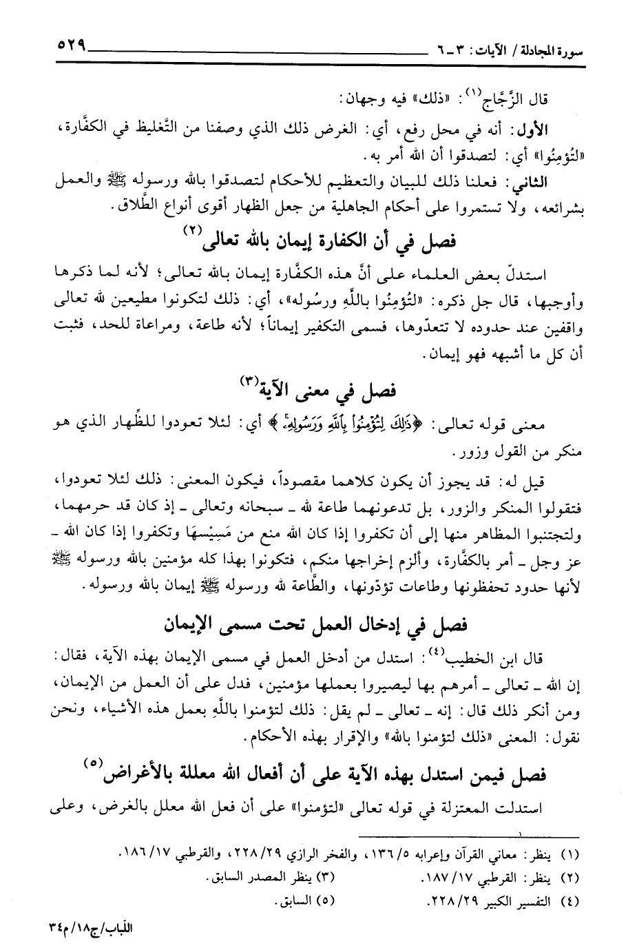 قيل له: قد يجوز أن يكون كلاهما مقصوداً، فيكون المعنى: ذلك لئلا تعودوا، فتقولوا المنكر والزور، بل تدعونهما طاعة لله - سبحانه وتعالى - إذ كان قد حرمهما، ولتجتنبوا المظاهر منها إلى أن تكفروا إذا كان الله منع من مَسِيْسهَا وتكفروا إذا كان الله - عَزَّ وَجَلَّ - أمر بالكفَّارة، وألزم إخراجها منكم، فتكونوا بهذا كله مؤمنين بالله ورسوله صَلَّى اللَّهُ عَلَيْهِ وَسَلَّم َ لأنها حدود تحفظونها وطاعات تؤدّونها، والطَّاعة لله ورسوله صَلَّى اللَّهُ عَلَيْهِ وَسَلَّم َ إيمان بالله ورسوله.