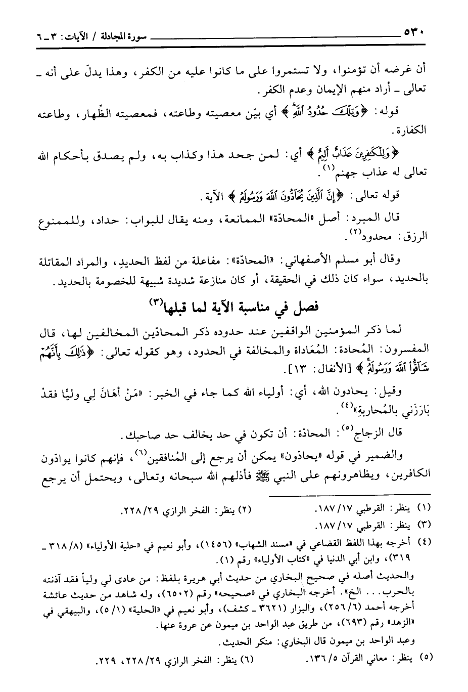 وقال أبو مسلم الأصفهاني: «المحادّة» : مفاعلة من لفظ الحديدِ، والمراد المقاتلة بالحديد، سواء كان ذلك في الحقيقة، أو كان منازعة شديدة شبيهة للخصومة بالحديد.