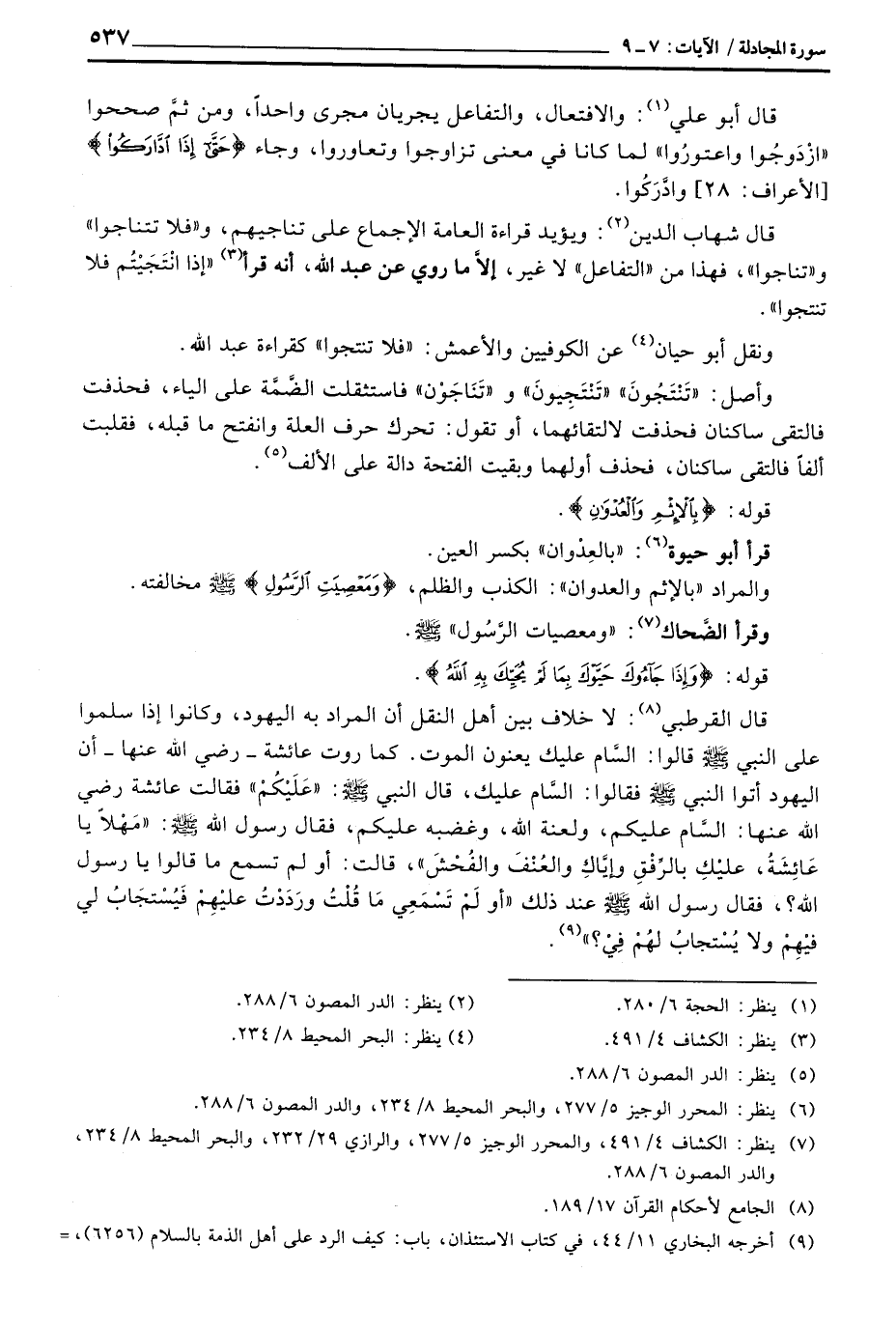 قال شهاب الدين: ويؤيد قراءة العامة الإجماع على تناجيهم، و «فلا تتناجوا» و «تناجوا» ، فهذا من «التفاعل» لا غير، إلاَّ ما روي عن عبد الله، أنه قرأ {إذا انْتَجَيْتُم فلا تنتجوا} .