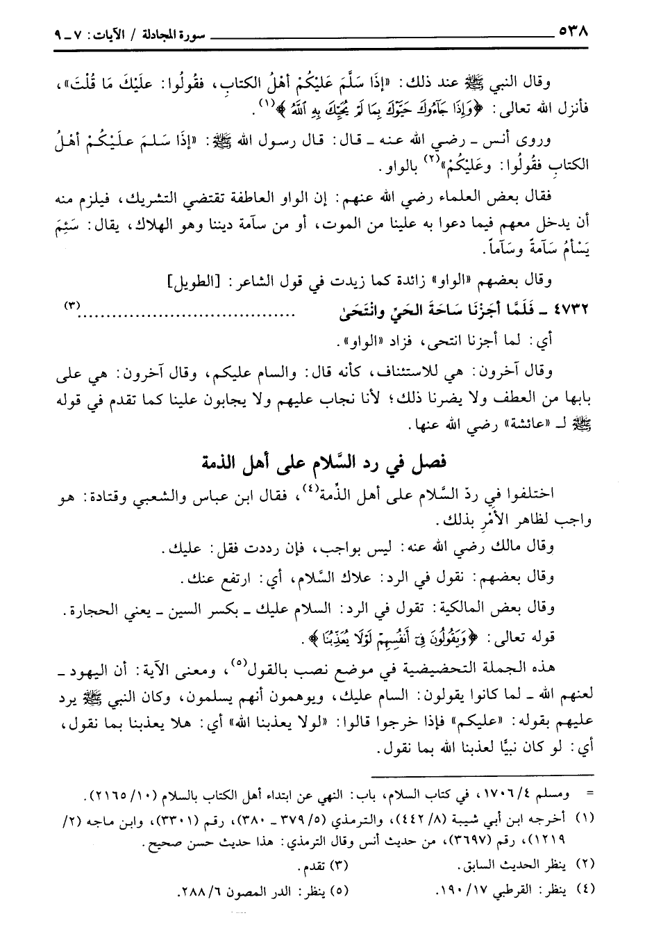 اختلفوا في ردّ السَّلام على أهل الذِّمة، فقال ابن عباس والشعبي وقتادة: هو واجب لظاهر الأمْرِ بذلك.