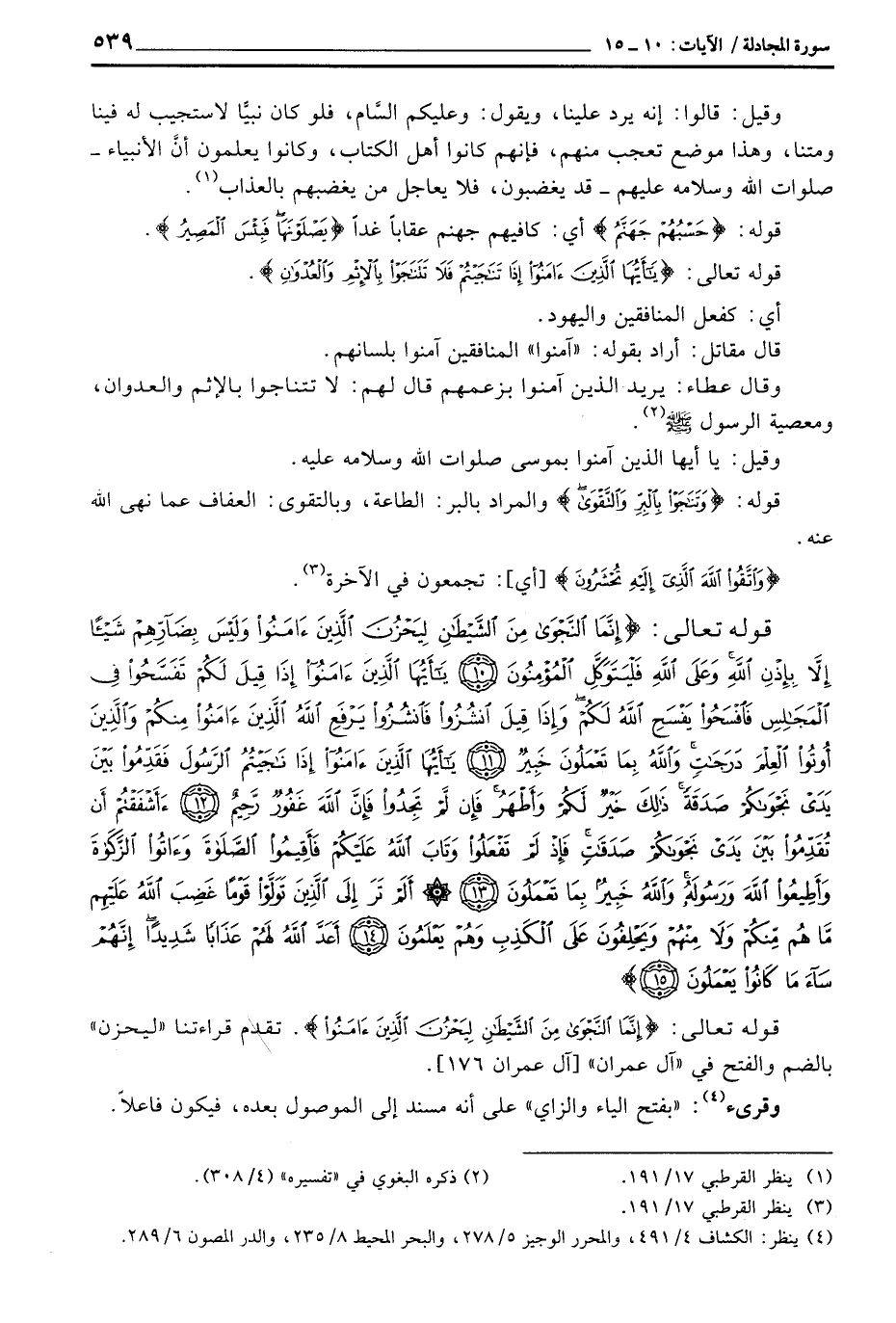 قوله تعالى: {إِنَّمَا النجوى مِنَ الشيطان لِيَحْزُنَ الذين آمَنُواْ} . تقدم قراءتنا «ليحزن» بالضم والفتح في «آل عمران» [آل عمران 176] .