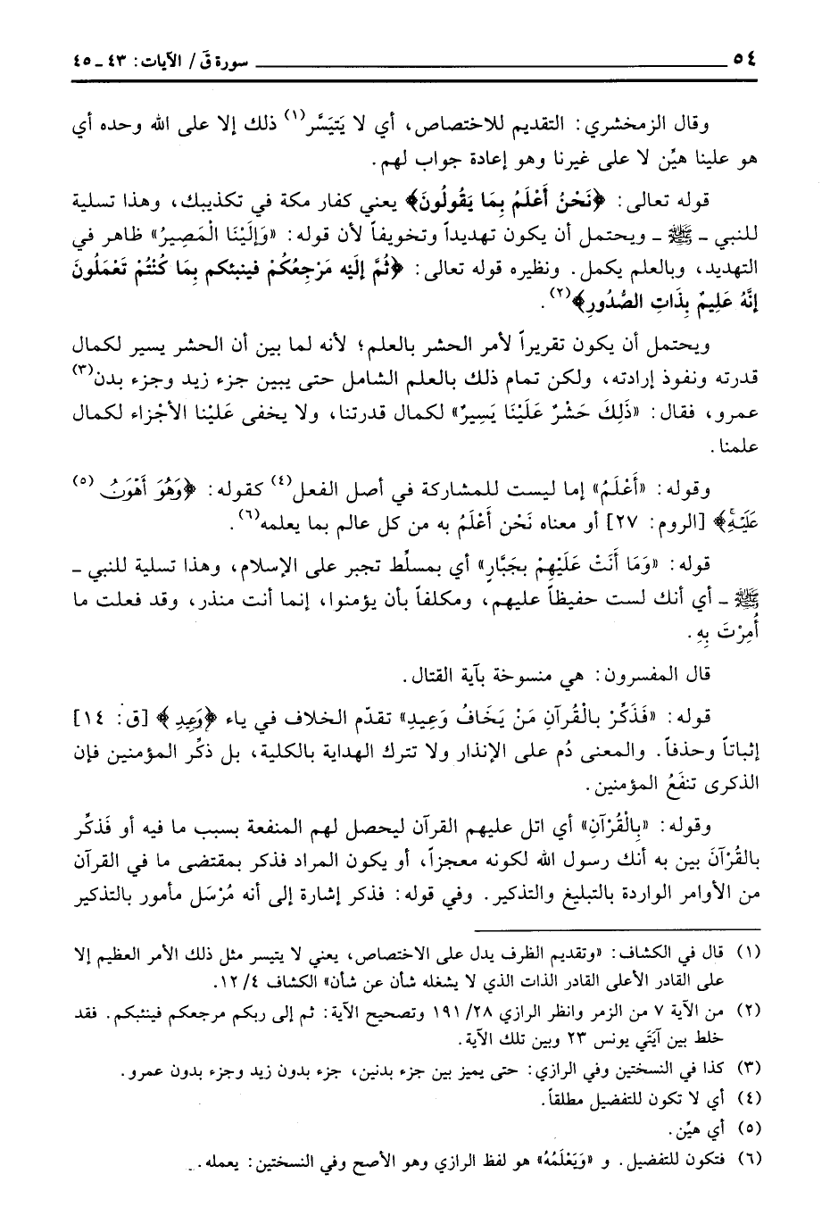 قوله تعالى: {نَّحْنُ أَعْلَمُ بِمَا يَقُولُونَ} يعني كفار مكة في تكذيبك، وهذا تسلية للنبي - صَلَّى اللَّهُ عَلَيْهِ وَسَلَّم َ - ويحتمل أن يكون تهديداً وتخويفاً لأن قوله: «وَإلَيْنَا الْمَصِيرُ» ظاهر في التهديد، وبالعلم يكمل. ونظيره قوله تعالى: {ثُمَّ إلى رَبِّكُمْ مَّرْجِعُكُمْ فَيُنَبِّئُكُمْ بِمَا كُنتُمْ تَعْمَلُونَ إِنَّهُ عَلِيمٌ بِذَاتِ الصدور} [الزمر: 7] .