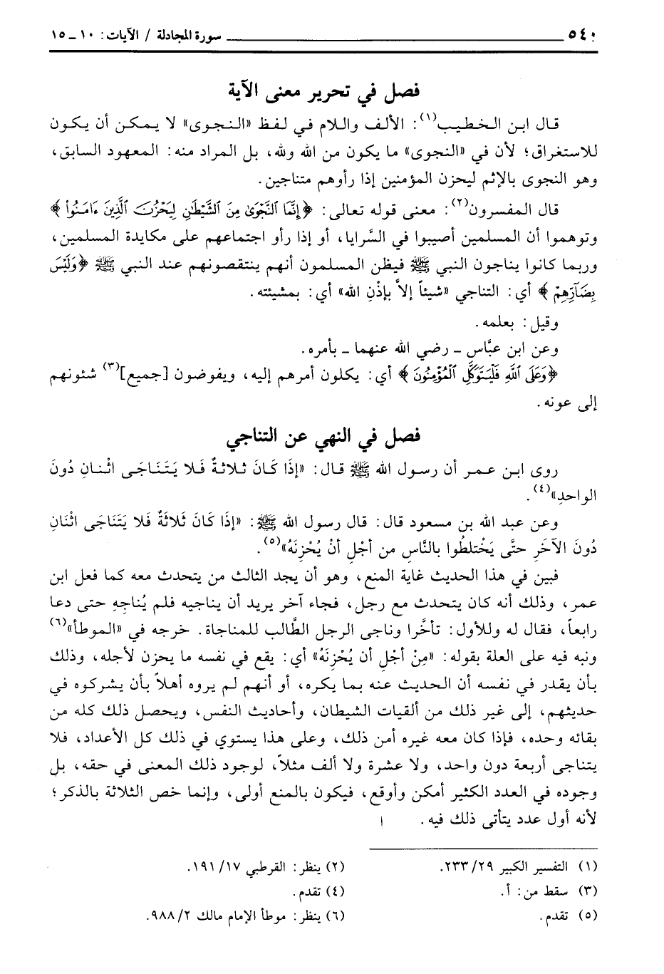 قال ابن الخطيب: الألف واللام في لفظ «النجوى» لا يمكن أن يكون للاستغراق؛ لأن في «النجوى» ما يكون من الله ولله، بل المراد منه: المعهود السابق، وهو النجوى بالإثم ليحزن المؤمنين إذا رأوهم متناجين.