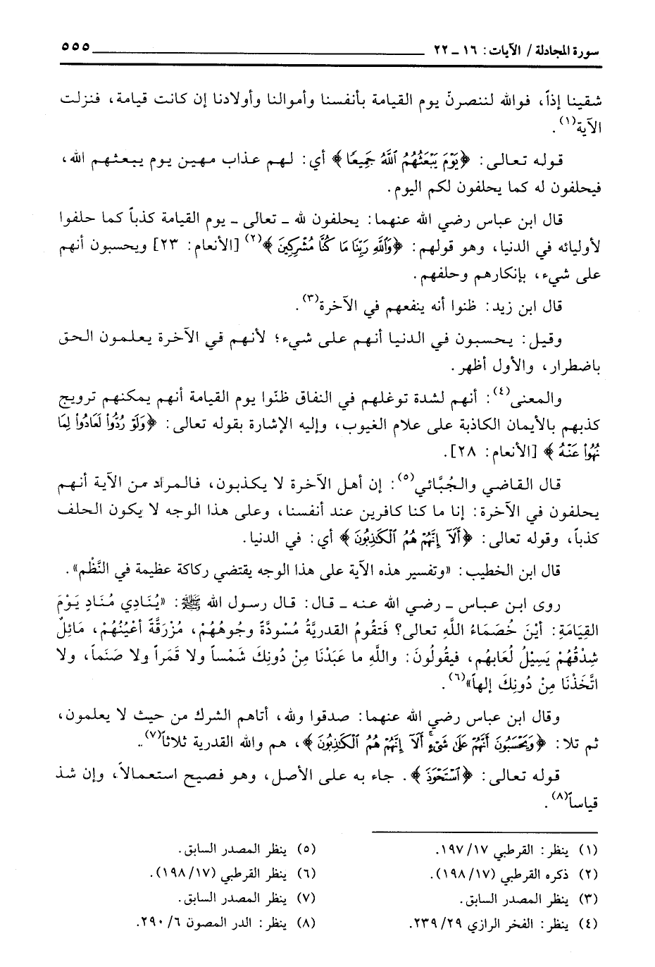 قال ابن عباس رَضِيَ اللَّهُ عَنْهما: يحلفون لله - تعالى - يوم القيامة كذباً كما حلفوا لأوليائه في الدنيا، وهو قولهم: {والله رَبِّنَا مَا كُنَّا مُشْرِكِينَ} [الأنعام: 23] ويحسبون أنهم على شيء، بإنكارهم وحلفهم.